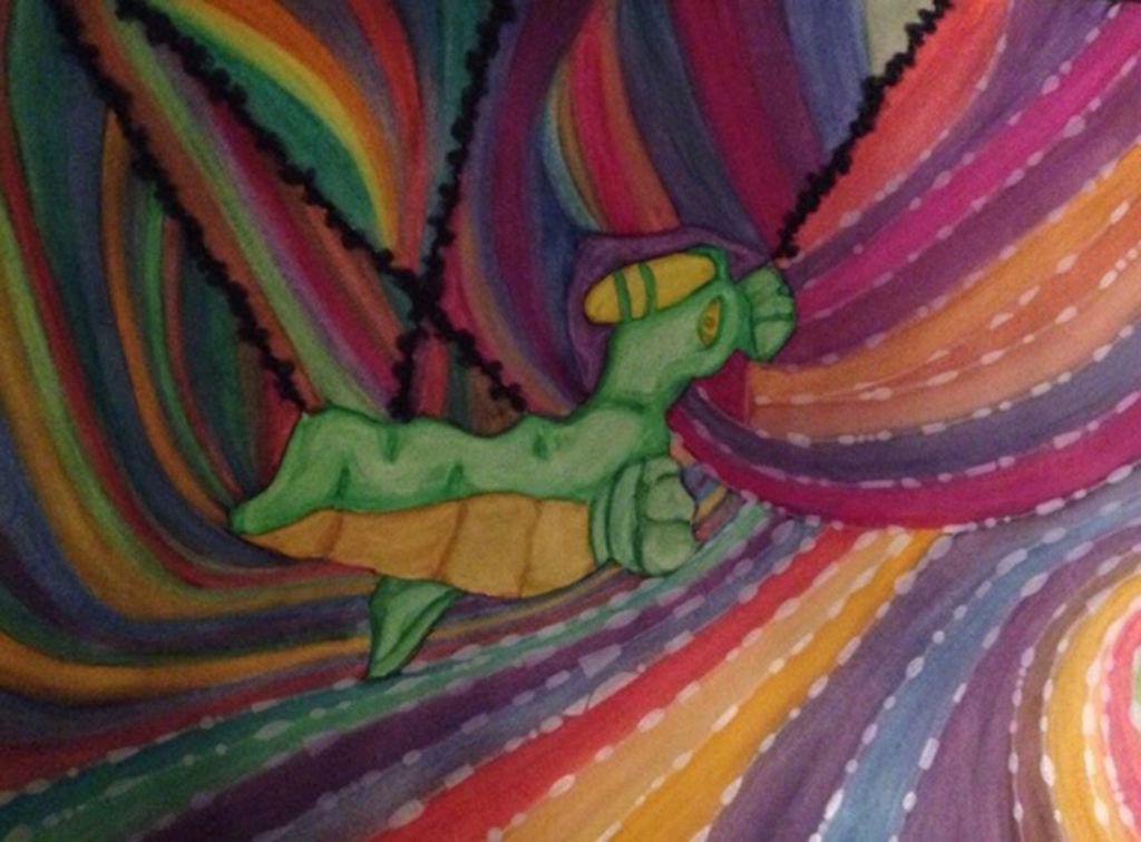 This is a drawing, which I painted with water-soluble colours. The ropes hold the Loch Ness dinosaur. In the environment you can see many different colours, which are leading in any direction. My idea was to create a colorful picture with a dinosaur in the middle. Maybe the Dino is able to see the world different than humans.